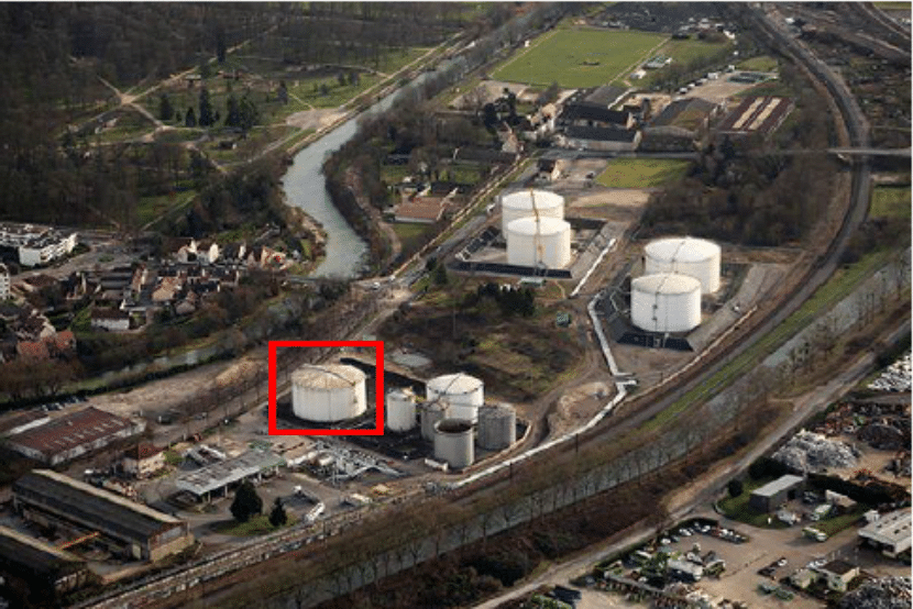 Historique du bac : construit en 1965, il avait initialement contenu de l’essence, il a été équipé d’un écran flottant en 2000, avant de passer en stockage de distillat (diesel/fioul) en 2010